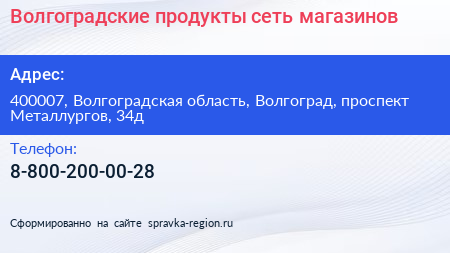 Волгоградские продукты, сеть магазинов по адресу 400007, Волгоградская область, Волгоград, проспект Металлургов, 34д в дальнейшем Организация, размещена в следующих категориях: