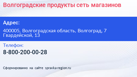 Волгоградские продукты, сеть магазинов по адресу 400005, Волгоградская область, Волгоград, 7 Гвардейской, 13 в дальнейшем Организация, размещена в следующих категориях: