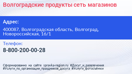 Волгоградские продукты, сеть магазинов по адресу 400087, Волгоградская область, Волгоград, Новороссийская, 16/1 в дальнейшем Организация, размещена в следующих категориях: