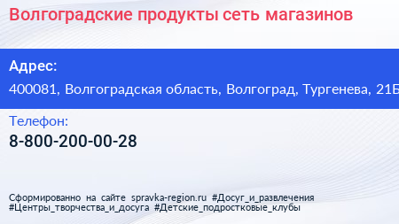 Волгоградские продукты, сеть магазинов по адресу 400081, Волгоградская область, Волгоград, Тургенева, 21Б в дальнейшем Организация, размещена в следующих категориях: