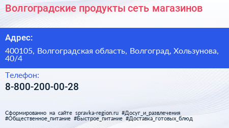 Волгоградские продукты, сеть магазинов по адресу 400105, Волгоградская область, Волгоград, Хользунова, 40/4 в дальнейшем Организация, размещена в следующих категориях: