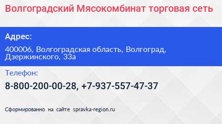 Волгоградский Мясокомбинат, торговая сеть по адресу 400006, Волгоградская область, Волгоград, Дзержинского, 33а в дальнейшем Организация, размещена в следующих категориях: