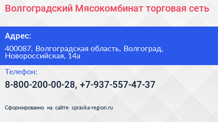 Волгоградский Мясокомбинат, торговая сеть по адресу 400087, Волгоградская область, Волгоград, Новороссийская, 14а в дальнейшем Организация, размещена в следующих категориях: