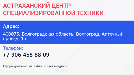АСТРАХАНСКИЙ ЦЕНТР СПЕЦИАЛИЗИРОВАННОЙ ТЕХНИКИ по адресу 400075, Волгоградская область, Волгоград, Аптечный проезд, 1а в дальнейшем Организация, размещена в следующих категориях: