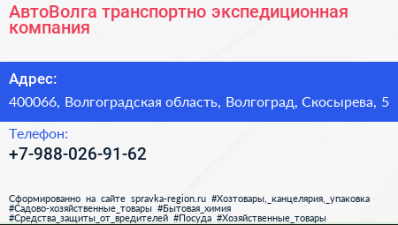 АвтоВолга, транспортно-экспедиционная компания по адресу 400066, Волгоградская область, Волгоград, Скосырева, 5 в дальнейшем Организация, размещена в следующих категориях: