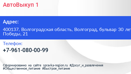 АвтоВыкуп №1 по адресу 400137, Волгоградская область, Волгоград, бульвар 30 лет Победы, 21 в дальнейшем Организация, размещена в следующих категориях: