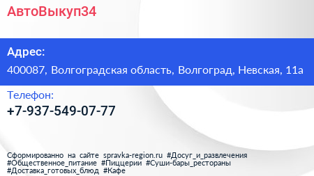 АвтоВыкуп34 по адресу 400087, Волгоградская область, Волгоград, Невская, 11а в дальнейшем Организация, размещена в следующих категориях: