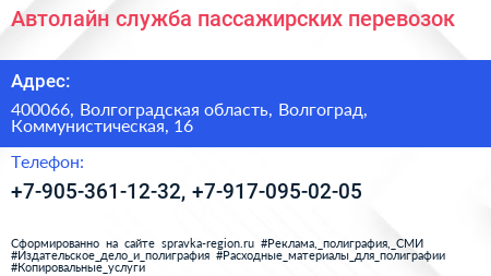 Автолайн, служба пассажирских перевозок по адресу 400066, Волгоградская область, Волгоград, Коммунистическая, 16 в дальнейшем Организация, размещена в следующих категориях: