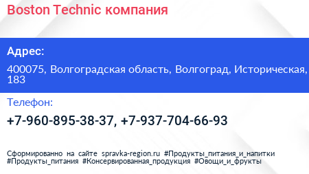 Boston Technic, компания по адресу 400075, Волгоградская область, Волгоград, Историческая, 183 в дальнейшем Организация, размещена в следующих категориях: