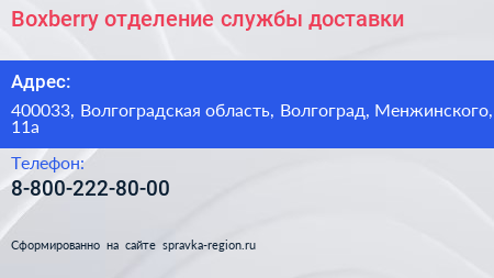 Boxberry, отделение службы доставки по адресу 400033, Волгоградская область, Волгоград, Менжинского, 11а в дальнейшем Организация, размещена в следующих категориях: