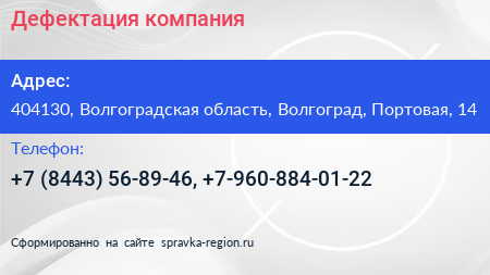Дефектация, компания по адресу 404130, Волгоградская область, Волгоград, Портовая, 14 в дальнейшем Организация, размещена в следующих категориях: