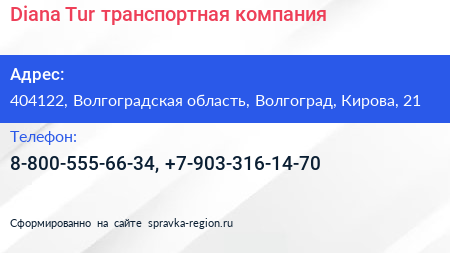 Diana Tur, транспортная компания по адресу 404122, Волгоградская область, Волгоград, Кирова, 21 в дальнейшем Организация, размещена в следующих категориях: