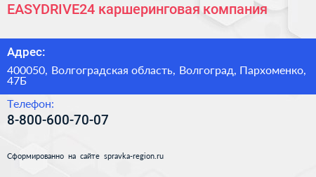 EASYDRIVE24, каршеринговая компания по адресу 400050, Волгоградская область, Волгоград, Пархоменко, 47Б в дальнейшем Организация, размещена в следующих категориях: