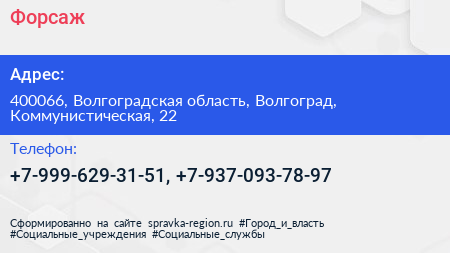 Форсаж+ по адресу 400066, Волгоградская область, Волгоград, Коммунистическая, 22 в дальнейшем Организация, размещена в следующих категориях: