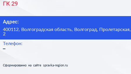 ГК №29 по адресу 400112, Волгоградская область, Волгоград, Пролетарская, 2 в дальнейшем Организация, размещена в следующих категориях: