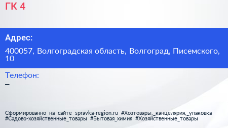 ГК №4 по адресу 400057, Волгоградская область, Волгоград, Писемского, 10 в дальнейшем Организация, размещена в следующих категориях: