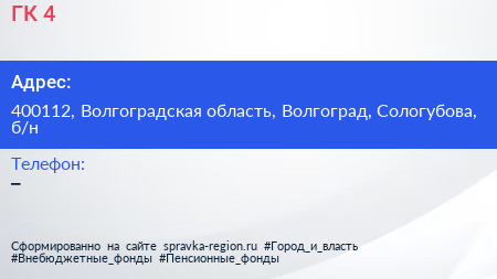 ГК №4 по адресу 400112, Волгоградская область, Волгоград, Сологубова, б/н в дальнейшем Организация, размещена в следующих категориях: