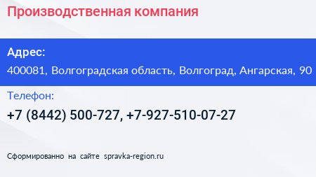 Производственная компания по адресу 400081, Волгоградская область, Волгоград, Ангарская, 90 в дальнейшем Организация, размещена в следующих категориях: