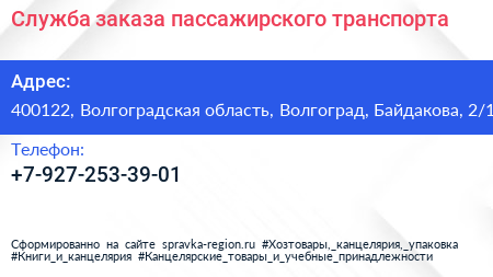 Служба заказа пассажирского транспорта по адресу 400122, Волгоградская область, Волгоград, Байдакова, 2/1 в дальнейшем Организация, размещена в следующих категориях: