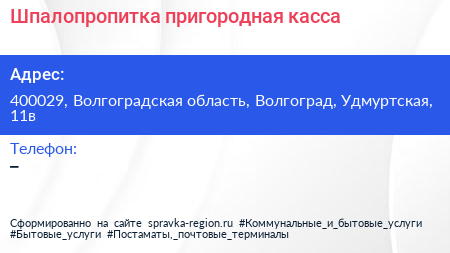 Шпалопропитка, пригородная касса по адресу 400029, Волгоградская область, Волгоград, Удмуртская, 11в в дальнейшем Организация, размещена в следующих категориях: