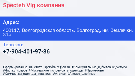 Specteh-Vlg, компания по адресу 400117, Волгоградская область, Волгоград, им. Землячки, 31а в дальнейшем Организация, размещена в следующих категориях: