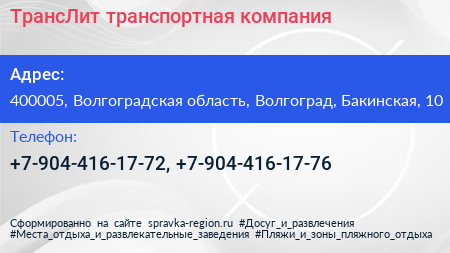 ТрансЛит, транспортная компания по адресу 400005, Волгоградская область, Волгоград, Бакинская, 10 в дальнейшем Организация, размещена в следующих категориях: