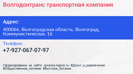 Волгодонтранс, транспортная компания по адресу 400066, Волгоградская область, Волгоград, Коммунистическая, 16 в дальнейшем Организация, размещена в следующих категориях: