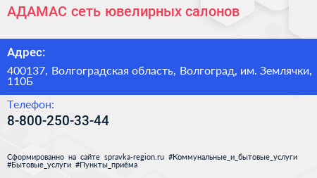 АДАМАС, сеть ювелирных салонов по адресу 400137, Волгоградская область, Волгоград, им. Землячки, 110Б в дальнейшем Организация, размещена в следующих категориях: