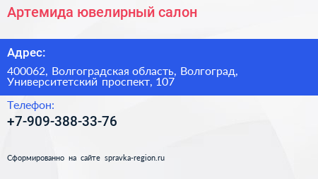 Артемида, ювелирный салон по адресу 400062, Волгоградская область, Волгоград, Университетский проспект, 107 в дальнейшем Организация, размещена в следующих категориях: