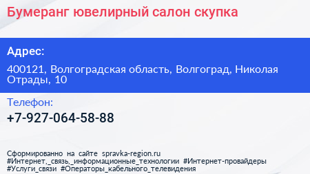 Бумеранг, ювелирный салон-скупка по адресу 400121, Волгоградская область, Волгоград, Николая Отрады, 10 в дальнейшем Организация, размещена в следующих категориях: