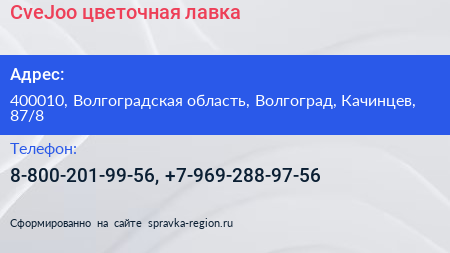 CveJoo, цветочная лавка по адресу 400010, Волгоградская область, Волгоград, Качинцев, 87/8 в дальнейшем Организация, размещена в следующих категориях: