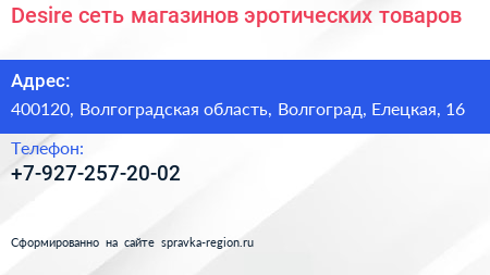 Desire, сеть магазинов эротических товаров по адресу 400120, Волгоградская область, Волгоград, Елецкая, 16 в дальнейшем Организация, размещена в следующих категориях:
