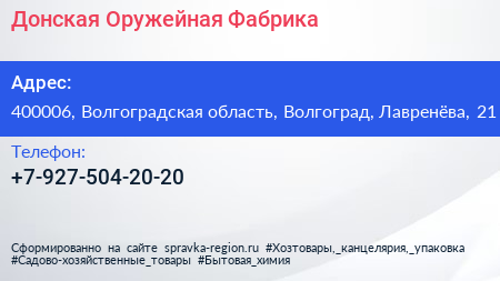 Донская Оружейная Фабрика по адресу 400006, Волгоградская область, Волгоград, Лавренёва, 21 в дальнейшем Организация, размещена в следующих категориях: