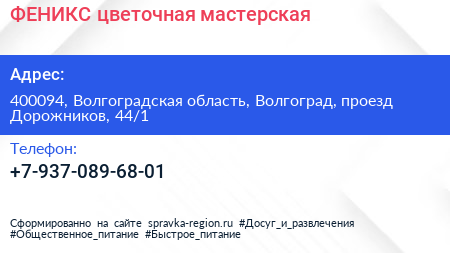 ФЕНИКС, цветочная мастерская по адресу 400094, Волгоградская область, Волгоград, проезд Дорожников, 44/1 в дальнейшем Организация, размещена в следующих категориях: