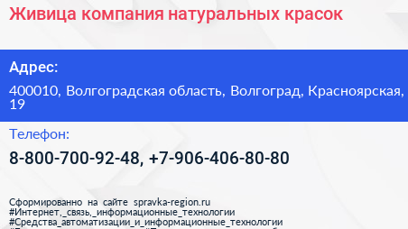 Живица, компания натуральных красок по адресу 400010, Волгоградская область, Волгоград, Красноярская, 19 в дальнейшем Организация, размещена в следующих категориях: