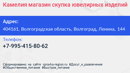 Камелия, магазин-скупка ювелирных изделий по адресу 404161, Волгоградская область, Волгоград, Ленина, 144 в дальнейшем Организация, размещена в следующих категориях: