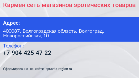 Кармен, сеть магазинов эротических товаров по адресу 400087, Волгоградская область, Волгоград, Новороссийская, 10 в дальнейшем Организация, размещена в следующих категориях: