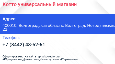 Котто, универсальный магазин по адресу 400010, Волгоградская область, Волгоград, Новодвинская, 22 в дальнейшем Организация, размещена в следующих категориях: