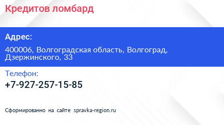 Кредитов, ломбард по адресу 400006, Волгоградская область, Волгоград, Дзержинского, 33 в дальнейшем Организация, размещена в следующих категориях: