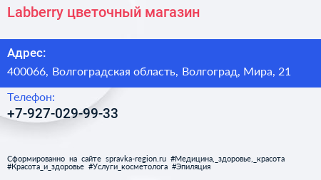 Labberry, цветочный магазин по адресу 400066, Волгоградская область, Волгоград, Мира, 21 в дальнейшем Организация, размещена в следующих категориях: