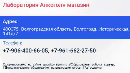 Лаборатория Алкоголя, магазин по адресу 400075, Волгоградская область, Волгоград, Историческая, 181д/7 в дальнейшем Организация, размещена в следующих категориях: