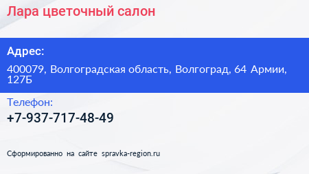 Лара, цветочный салон по адресу 400079, Волгоградская область, Волгоград, 64 Армии, 127Б в дальнейшем Организация, размещена в следующих категориях:
