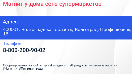 Магнит у дома, сеть супермаркетов по адресу 400001, Волгоградская область, Волгоград, Профсоюзная, 18 в дальнейшем Организация, размещена в следующих категориях: