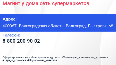 Магнит у дома, сеть супермаркетов по адресу 400067, Волгоградская область, Волгоград, Быстрова, 68 в дальнейшем Организация, размещена в следующих категориях: