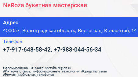 NeRoza, букетная мастерская по адресу 400057, Волгоградская область, Волгоград, Коллонтай, 14 в дальнейшем Организация, размещена в следующих категориях:
