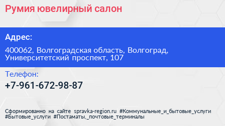 Румия, ювелирный салон по адресу 400062, Волгоградская область, Волгоград, Университетский проспект, 107 в дальнейшем Организация, размещена в следующих категориях: