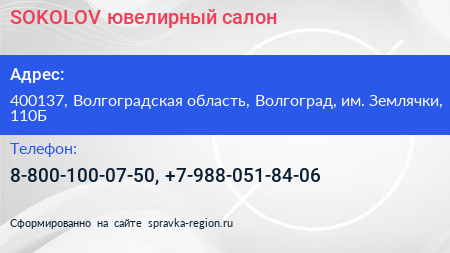 SOKOLOV, ювелирный салон по адресу 400137, Волгоградская область, Волгоград, им. Землячки, 110Б в дальнейшем Организация, размещена в следующих категориях: