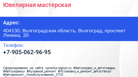 Ювелирная мастерская по адресу 404130, Волгоградская область, Волгоград, проспект Ленина, 20 в дальнейшем Организация, размещена в следующих категориях: