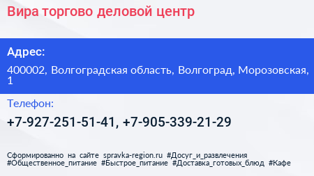 Вира, торгово-деловой центр по адресу 400002, Волгоградская область, Волгоград, Морозовская, 1 в дальнейшем Организация, размещена в следующих категориях: