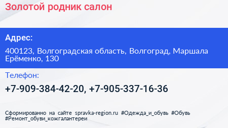 Золотой родник, салон по адресу 400123, Волгоградская область, Волгоград, Маршала Ерёменко, 130 в дальнейшем Организация, размещена в следующих категориях: